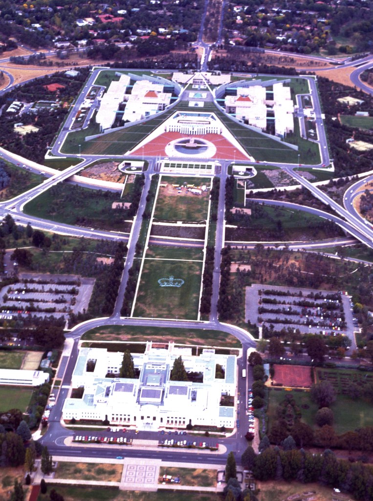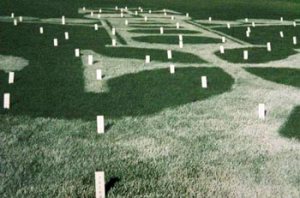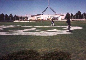 ‘Crown Land’ | Acrylic paint on grass. 30m x 40m. Includes 207 First Nations’ place name plaques. Exhibited as part of the National Sculpture Forum, 1995. Parliamentary Circle, Canberra.